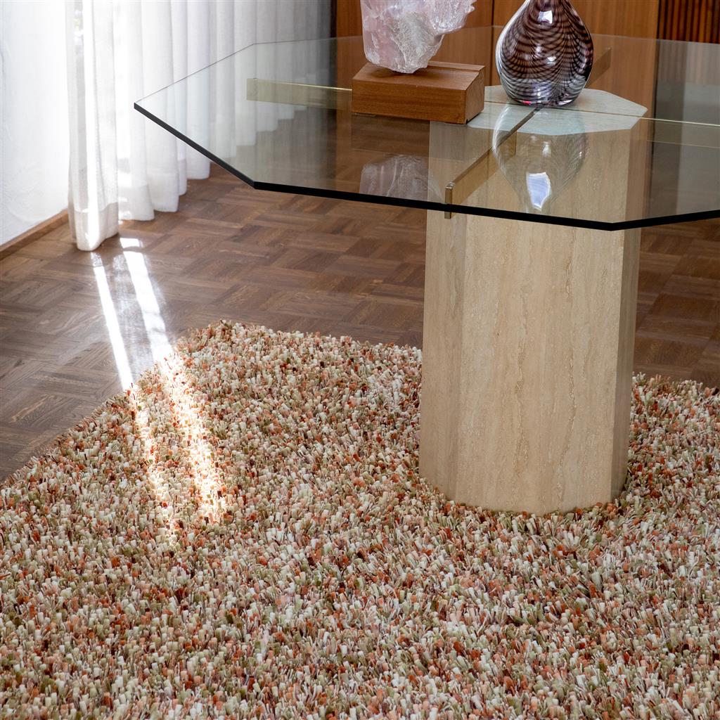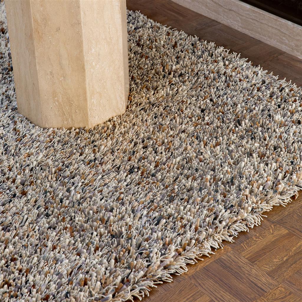 Wat de Spring zo bijzonder maakt, is het spel van verschillende garens. Door dikke en dunne woldraden met elkaar te combineren, ontstaat een unieke textuur die zowel dynamisch als verfijnd aanvoelt. Dit geeft elk kleed een levendig karakter en een moderne uitstraling.
